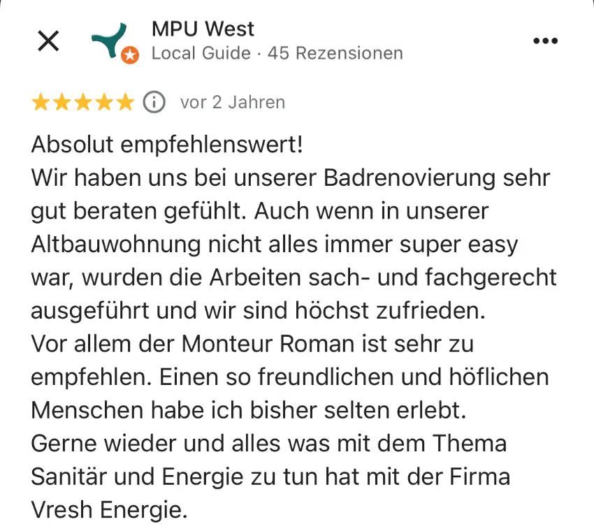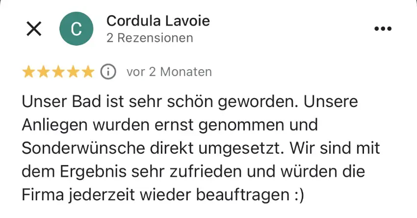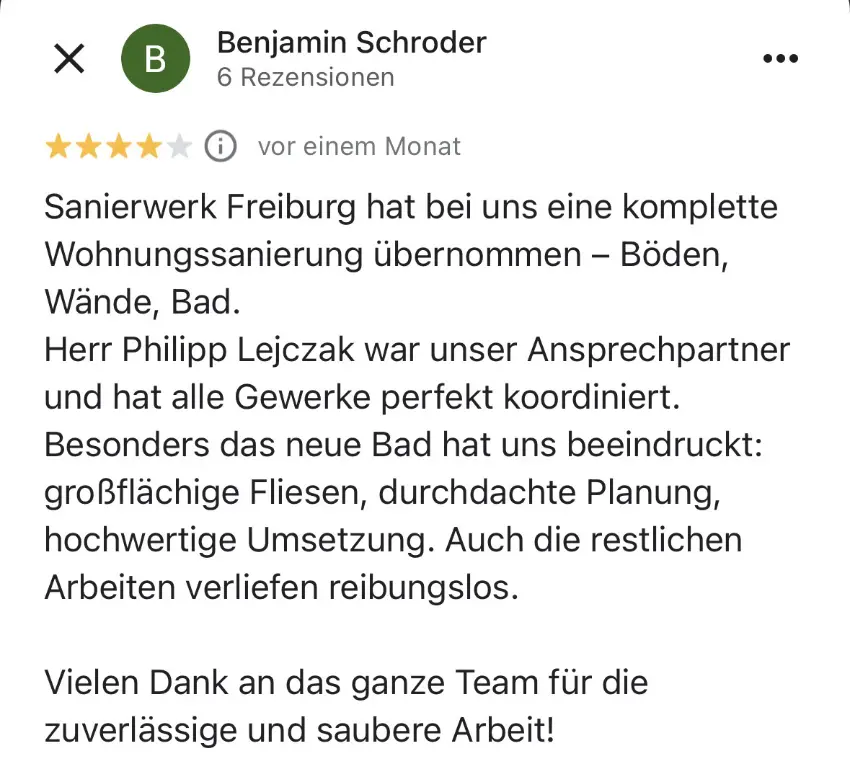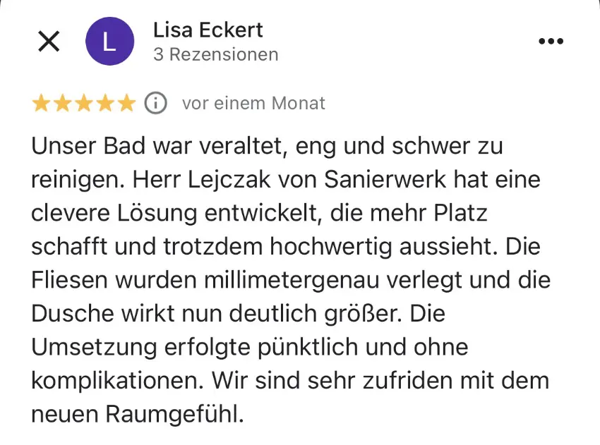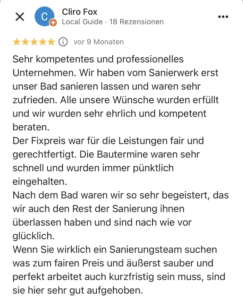 Die Sanierung kann in etwa 4-6 Wochen starten. Da wir das ganze Jahr über arbeiten und keinen festen Betriebsurlaub haben, sind wir flexibel. Sie können Ihr bevorzugtes Umbau-Datum auswählen. Klicken Sie dafür Hier