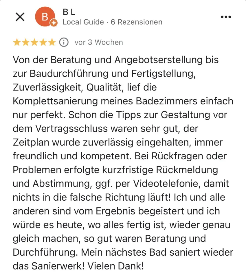 In der Regel dauert eine komplette Bad-Vollsanierung mit Leitungen und Abbruch und Trockenbauarbeiten und Montage etc. zwischen 2 bis 3 Wochen.